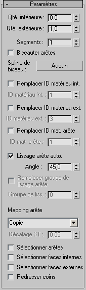 Spécifie l'ID de matériau des faces d'arêtes. Cette option est uniquement disponible lorsque l'option Remplacer ID mat. arête est activée.