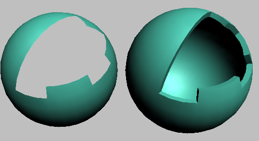 Coque est généralement utilisé sur un objet dont une partie de la surface est supprimée, tel qu'une sphère ayant plusieurs sommets ou faces manquants, comme illustré ci-dessus. Pour des résultats optimaux, les polygones d'origine doivent être orientés vers l'extérieur. Si un objet n'a pas de faces ayant au moins une arête libre, Coque ne crée aucune arête.