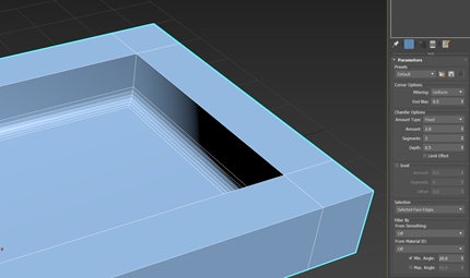 Remarque : 3ds Max propose plusieurs méthodes permettant d'obtenir le même résultat, mais celle-ci est recommandée pour examiner les options du modificateur Chanfrein.