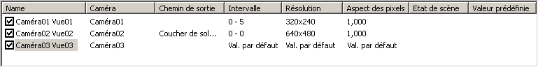 Répertorie toutes les tâches de caméra sélectionnées pour le rendu en différé. La file d'attente des tâches est constituée de huit colonnes affichant tous les paramètres définis pour une tâche de caméra donnée. Vous pouvez déterminer les tâches devant être rendues en activant les cases appropriées dans la liste.