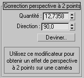 Le modificateur correction caméra applique une perspective à deux points à une vue de caméra. Les vues de caméra utilisent par défaut une perspective à trois points dans laquelle les lignes verticales semblent converger avec la hauteur. Dans une perspective à deux points, les lignes verticales restent verticales.