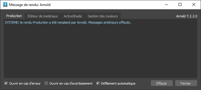 La fenêtre de message de rendu affiche les erreurs et les autres messages de certains rendus (sauf pour le rendu Rendu lignes de balayage par défaut).