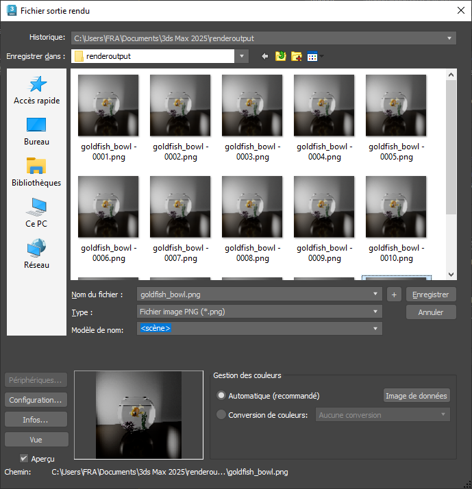 - La liste déroulante vous permet de sélectionner un nom de fichier en fonction de la scène 3ds Max et des paramètres du système.