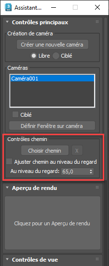 - Ouvrez l’assistant de visite virtuelle. Menu par défaut : menu Animation > Assistant de visite virtuelle > Panneau déroulant Contrôles avancés. (Menu de la touche Alt : menu Animation > Outils (Animation) > Assistant de visite virtuelle > Panneau déroulant Contrôles avancés.) Dans la zone Contrôles chemin, cliquez sur Choisir trajectoire, puis cliquez sur la trajectoire que vous avez créée. La caméra s’accroche à la trajectoire que vous avez créée.