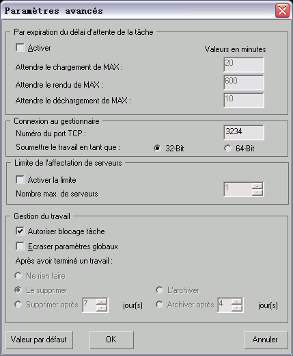 La boîte de dialogue Paramètres avancés vous permet de définir des délais d'expiration tâche par tâche, d'affecter le numéro de port TCP, de spécifier les scripts de pré-rendu et d'affecter la gestion du travail et les paramètres d'archivage.