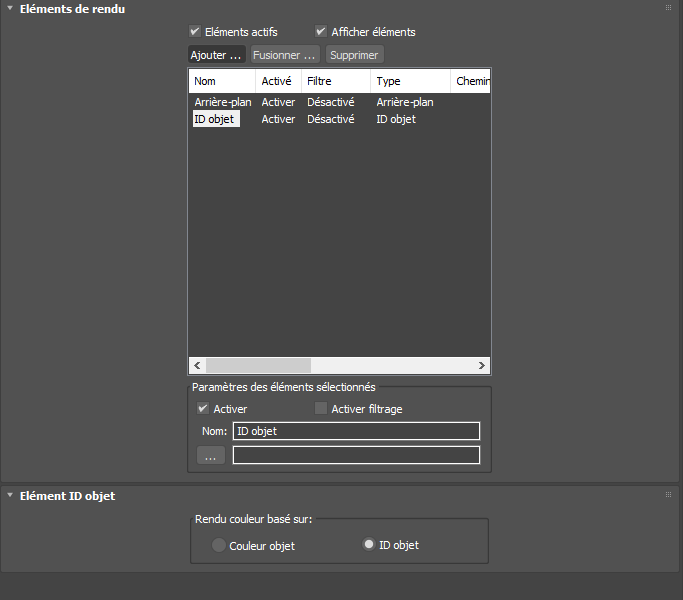 - Cliquez sur ce bouton pour fusionner les éléments de rendu à partir d'une autre scène 3ds Max. Une boîte de dialogue s'affiche pour vous permettre de sélectionner le fichier MAX dont vous voulez utiliser les éléments. La liste d'éléments de rendu du fichier sélectionné est ajoutée à la liste en cours.