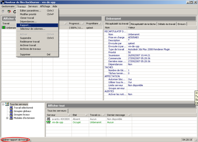 Utilisé pour obtenir des informations sur les travaux de rendu. La plupart des fonctions du menu Travaux sont disponibles uniquement quand au moins un des travaux est mis en surbrillance dans la liste des travaux, et peut nécessiter qu'une seule tâche soit mise en surbrillance.