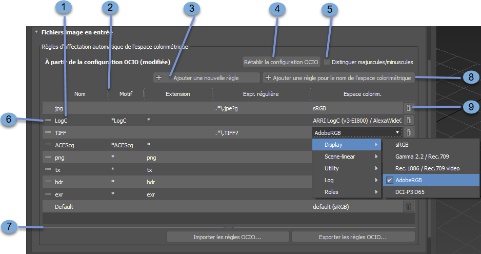 paramètres de gestion des couleurs. Les règles sont uniquement disponibles lorsque vous utilisez un mode de gestion des couleurs basé sur OCIO. Il existe trois types de règles :