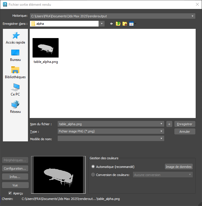Remarque : Le bouton Configuration n'est disponible qu'après précision d'un nom et d'un type de fichier. Si vous avez déjà choisi un type dans la liste déroulante Type de fichier, cliquez n’importe où dans la boîte de dialogue pour activer le bouton Configuration. Si vous avez commencé par saisir un nom de fichier et une extension (par exemple test.png), appuyez sur la touche Tabulation pour activer le bouton Configuration. De plus, lorsque vous cliquez sur Configuration, vous utilisez l’extension de nom de fichier, même si elle est différente du paramètre Type de fichier.
