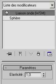 La déformation spatiale Onde comporte également le paramètre Flexibilité que vous pouvez régler dans la pile de chaque objet lié, au niveau Liaison onde. Ce paramètre appartient à chaque liaison ; il ne figure donc pas parmi les paramètres de la déformation Onde.