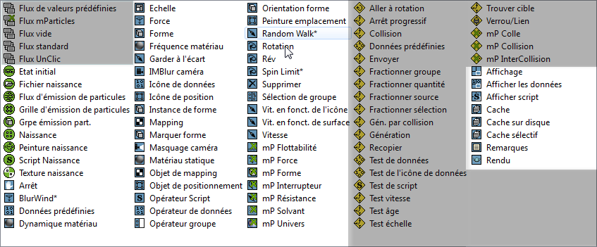 Le second groupe, situé à la fin de la liste du dépôt, contient des opérateurs qui servent essentiellement d'utilitaires : Cache, destiné à l'optimisation de la lecture du système de particules ; Afficher, qui permet de déterminer l'aspect des particules dans les fenêtres ; Remarques, qui permet d'ajouter des commentaires ; et, enfin, Rendu, qui sert à spécifier des caractéristiques de rendu.