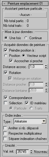 L'opérateur Peinture emplacement utilise un assistant Peinture particule pour obtenir des valeurs de départ particules à partir desquelles il peut générer des particules. L'option Peinture emplacement configure les positions, la rotation et le mapping des particules.