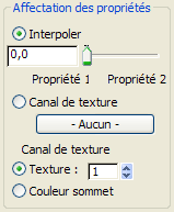 Détermine une texture et applique les paramètres Propriété 1 et Propriété 2 à l'objet tissu. Vous pouvez ajouter une texture en niveaux de gris afin de fusionner les deux propriétés définies dans la boîte de dialogue des propriétés de l'objet. Le noir représente le paramètre Propriété 1 et le blanc le Paramètre Propriété 2. Toute valeur en niveau de gris fait fusionner les deux propriétés. Vous pouvez faire glisser une texture sur ce bouton.