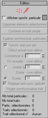 Le panneau déroulant Edition vous permet de supprimer les valeurs de départ particules indésirables ou le trait dans son ensemble, d'ajuster la synchronisation du trait/de la particule, ainsi que de sélectionner les particules/traits et de transférer les données de sélection aux opérateurs Peinture naissance et Peinture emplacement. Il n'est pas possible de manipuler directement les valeurs de départ des particules sélectionnées à l'aide des outils 3ds Max standard tels que Déplacement et Rotation.