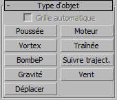 Ces déformations spatiales dévient les particules. Le panneau déroulant Type obj. pris en charge indique les systèmes pris en charge par chaque déformation spatiale.