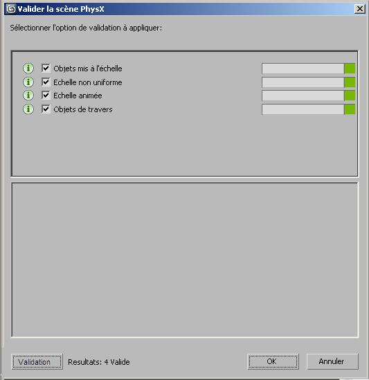 Pour vous assurer que la scène contient une simulation valide, utilisez la commande Valider la scène MassFX du sous-menu Utilitaires ou le groupe de fonctions Outils. La boîte de dialogue Valider la scène MassFX s'ouvre alors :