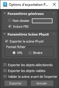 Important : L'option Exporter PhysX permet d'enregistrer la scène dans un format lisible par les applications qui utilisent le SDK PhysX. Cette rubrique présente brièvement la fonction Exporter mise en oeuvre dans 3ds Max. Pour plus d'informations sur cet outil d'exportation et ses options, reportez-vous à la documentation fournie avec le SDK PhysX.