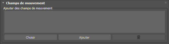 - Cliquez sur Choisir pour sélectionner dans la scène des objets à ajouter en tant que champ de mouvement, ou cliquez sur Ajouter pour sélectionner un champ de mouvement dans une boîte de dialogue. Cliquez sur Supprimer pour supprimer un champ de mouvement sélectionné.