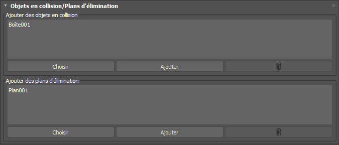 - Cliquez sur Choisir pour sélectionner dans la scène des objets à ajouter en tant qu'objets en collision, ou cliquez sur Ajouter pour sélectionner des objets en collision dans une boîte de dialogue. Cliquez sur Supprimer pour supprimer un objet en collision sélectionné.
