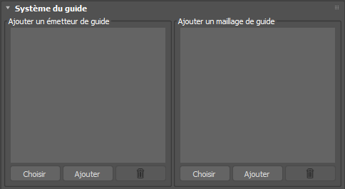 - Cliquez sur Choisir pour sélectionner dans la scène des objets à ajouter en tant qu'émetteur de guide, ou cliquez sur Ajouter pour sélectionner un émetteur de guide dans une boîte de dialogue. Cliquez sur Supprimer pour supprimer un émetteur de guide sélectionné.