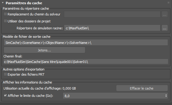 Le cache utilisateur enregistre la simulation de fluide calculée en tant que fichiers stockés sur le disque (un fichier par image). Par la suite, la simulation lit les fichiers cache de chaque image au lieu de recalculer toute la simulation. Le groupe de fonctions Mise en cache permet de configurer les paramètres.