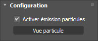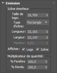 Ce groupe de fonctions permet de définir les caractéristiques physiques de l'icône émetteur (source de particule), ainsi que le pourcentage de particules produites dans les fenêtres et lors du rendu.