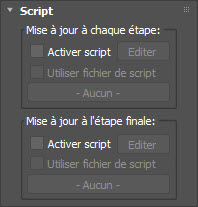 Ce panneau déroulant vous permet d'appliquer un script au système de particule, à chaque étape d'intégration, ainsi qu'après la dernière étape d'intégration de chaque image que vous visualisez. A chaque étape, utilisez un script de mise à jour pour définir les propriétés dépendantes de l'historique et, à l'étape finale, un script de mise à jour pour définir les propriétés indépendantes de l'historique.