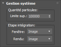 A chaque étape d'intégration, Particle Flow met à jour le système de particules, en appliquant chaque action active aux particules contenues dans son événement. Une étape d'intégration plus petite peut améliorer la précision aux dépens du temps de calcul. Ces paramètres vous permettent d'appliquer différentes étapes d'intégration à l'animation de particules dans les fenêtres et au moment du rendu.