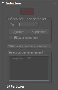 Chaque particule a un ID unique, commençant par 1 pour la première particule et ainsi de suite. Utilisez ces commandes pour sélectionner et désélectionner des particules en fonction de leur numéro d'ID. Cette option est uniquement disponible au niveau de sélection Particule.