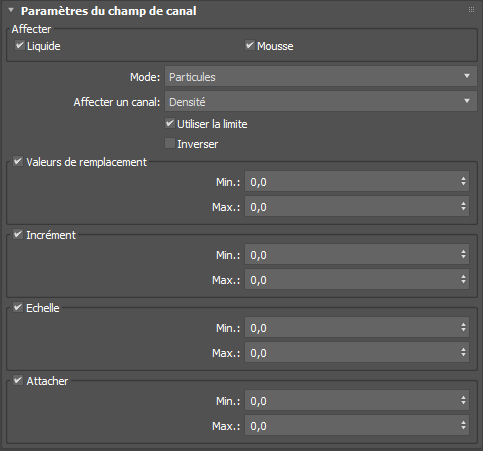 Permet de définir s'il convient de modifier un canal défini sur les particules ou les voxels. Certains canaux sont disponibles pour les particules ou les voxels uniquement, tandis que d'autres sont disponibles pour les deux.