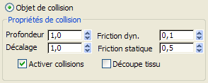 La zone Propriétés de collision permet de contrôler le comportement d'un objet de collision dans une simulation de tissu. Les objets en tissu rebondissent, sont enveloppés ou déchirés par les objets de collision.