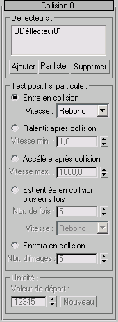 Le test Collision vérifie les particules qui heurtent une ou plusieurs déformations spatiales Déflecteur spécifiées. Il peut aussi vérifier si une particule a ralenti ou accéléré après une ou plusieurs collisions, si elle est entrée en collision plusieurs fois et, même, si elle heurtera un déflecteur dans un nombre d'images donné.