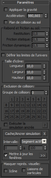 Avec un grand nombre de particules (des milliers de particules), vous pouvez accélérer de façon significative le calcul de la simulation en activant cette option. L'accélération du calcul s'obtient au détriment de la mémoire : si les limites de l'univers sont connues (lorsque cette option est activée), le moteur de simulation MassFX réalise une analyse spatiale de ce volume par rapport à la position des particules.