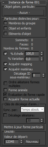 - Cliquez sur ce bouton, puis sélectionnez un objet géométrique dans la scène à utiliser comme forme de particules. Le curseur de la souris se transforme en croix lorsqu’il se trouve sur un objet pouvant servir d’objet de référence. Les objets valides peuvent être des objets à formes multiples tels que des groupes et des hiérarchies ; reportez-vous à la rubrique Zone Particules distinctes pour.