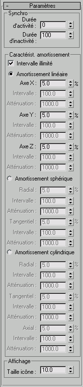 Cette zone vous permet de sélectionner l'amortissement linéaire, sphérique ou cylindrique ainsi qu'un ensemble de paramètres correspondant à chacun de ces types.