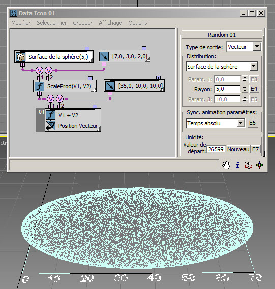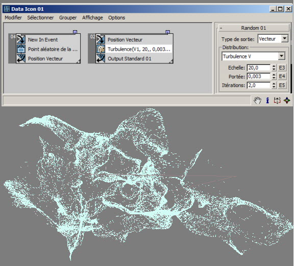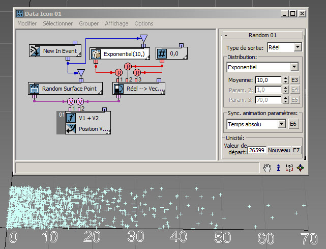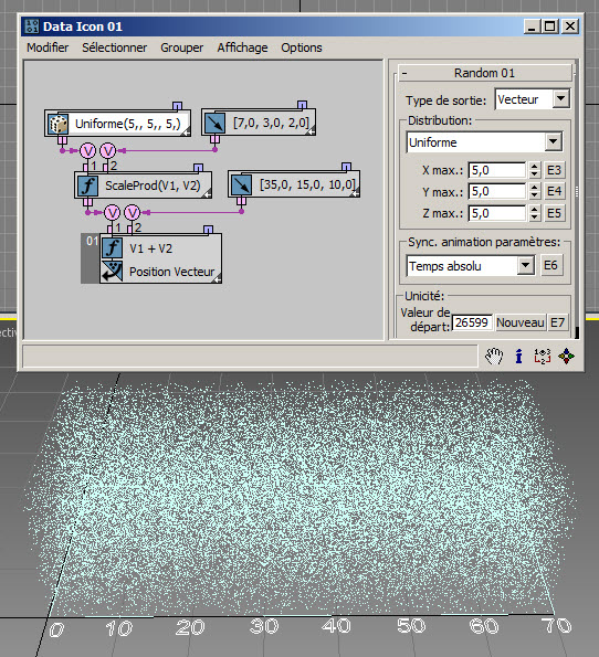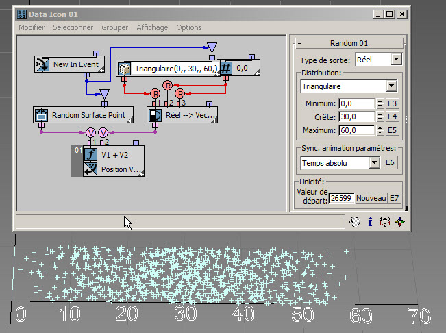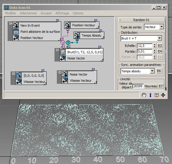 Dans l'exemple suivant ( RandomTemplate08.max ), les particules sont placées de manière aléatoire sur la surface de l'icône de l'opérateur de données, puis la position est utilisée comme entrée du sous-opérateur Aléatoire avec l'option Bruit V. Les données de sortie sont utilisées pour définir la hauteur des particules (axe Z).