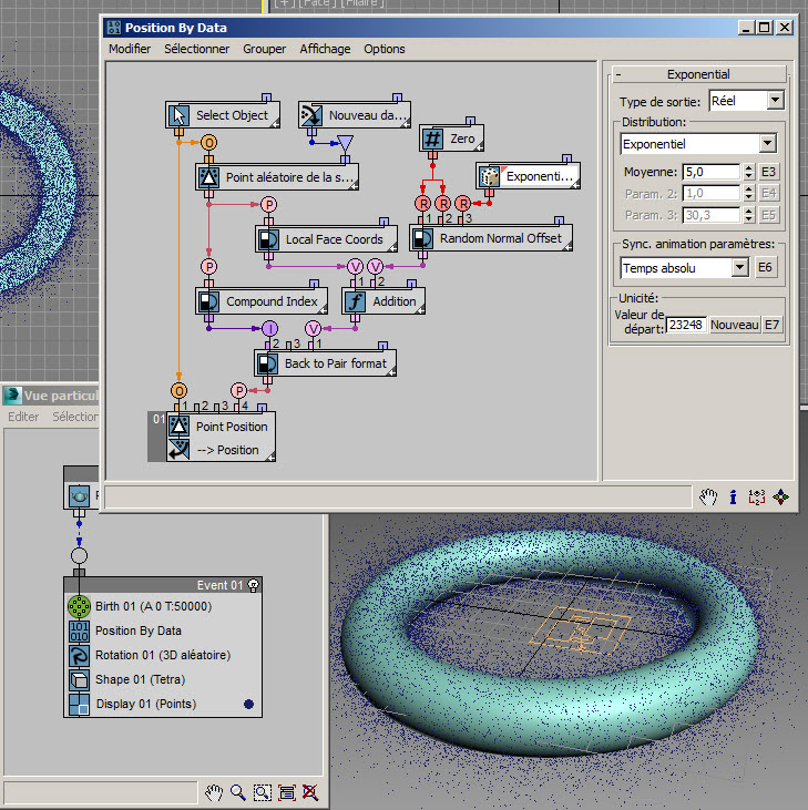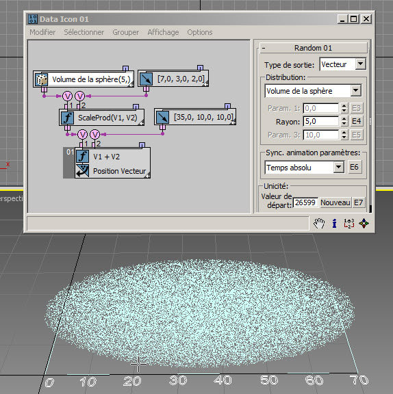 Commençons par un exemple de positionnement chaotique des particules autour d'un objet de référence : reportez-vous au fichier inclus RandomPositioning.max .