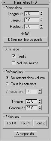 Ces options permettent d'ajuster les dimensions d'unités du volume source et de spécifier le nombre de points de contrôle du treillis. A noter que les dimensions de points apparaissent également en regard du nom du modificateur dans la liste Pile.
