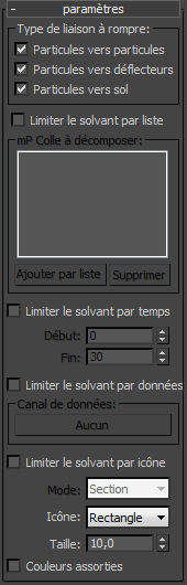 - Vous pouvez définir un canal de données de type Booléen à utiliser comme guide pour dissoudre les liaisons. Si la donnée est True pour une particule, toutes les liaisons de la particule sont dissoutes. Cliquez sur le bouton Canal de données pour choisir un sous-opérateur Sortie nouveau produisant des valeurs booléennes.