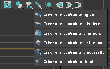Un objet assistant Contrainte peut lier deux corps rigides ou en ancrer un seul sur une position fixe dans l'espace global. La contrainte constitue une relation hiérarchique: l'objet enfant doit être un corps rigide dynamique, tandis que l'objet parent peut être dynamique, cinématique ou nul (à ancrer dans l'espace global).