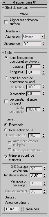 Conseil : par défaut, la marque laissée par Marquer forme est toujours rectangulaire, quelle que soit la forme des particules. Pour laisser une marque de forme différente, choisissez dans la zone Forme