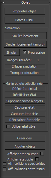 Ouvre la boîte de dialogue Propriétés Objet, qui vous permet de définir les objets à inclure à la simulation, si ces derniers sont des tissus ou des objets entrant en collision avec d'autres, ainsi que les paramètres qui leur sont associés.