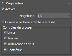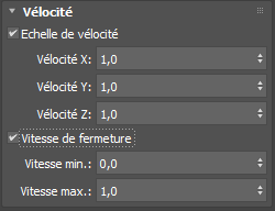 - Permet d'utiliser l'échelle de vélocité qui définit les facteurs d'échelle appliqués aux composants X, Y et Z des vélocités des particules. Les vitesses obtenues avec des valeurs supérieures à 1.0 peuvent être très élevées. Il peut donc s'avérer nécessaire de limiter les vitesses lors de l'utilisation de l'échelle de vélocité.