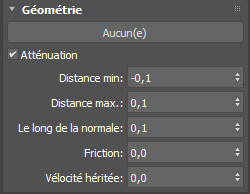 - Affiche le panneau déroulant Géométrie, ce qui a une incidence sur les vélocités des particules, en fonction des surfaces maillées connectées.