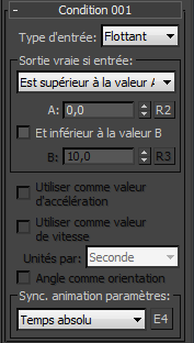 - Permet de choisir le type de données à comparer. Les options et les types de données sont : Angle (réel), Flottant (réel), Entier (entier), Pourcentage (réel), Temps (temps), Unité univers (réel). Ce paramètre détermine le type de donnée de sortie pouvant être reliée à l'entrée du sous-opérateur Condition.