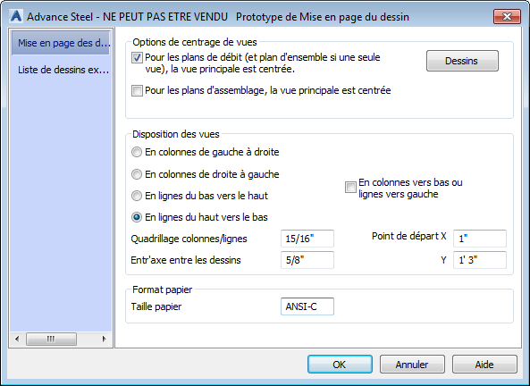 La boîte de dialogue Prototype de Mise en page du dessin propose des options qui s'appliquent à tous les types de dessin :