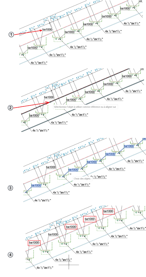 - Les labels sont alignés sur le label de référence, dans la direction indiquée par la poutre inclinée.