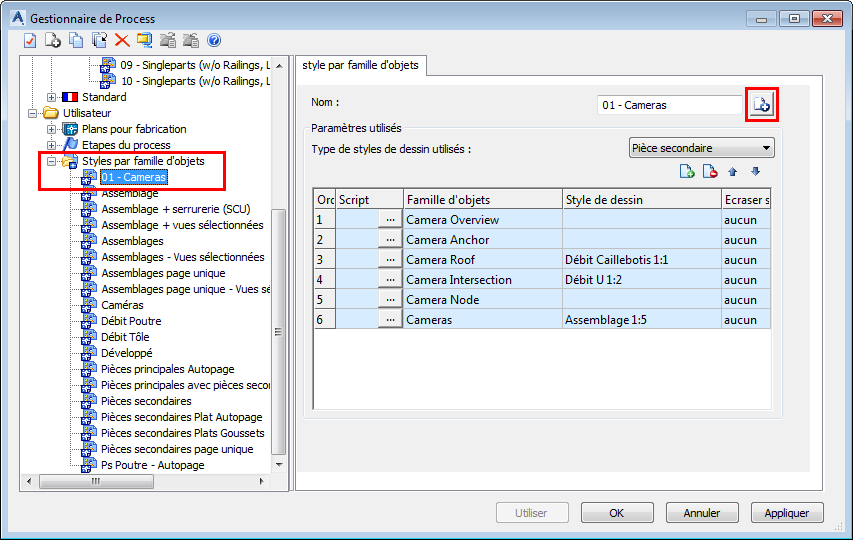 - Styles de dessin - Styles par famille d'objets : il s'agit de la configuration principale d'un process qui attribue un style de dessin pour chaque objet détaillé. Pour accéder à la configuration Styles par famille d'objets, cliquez sur le bouton