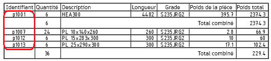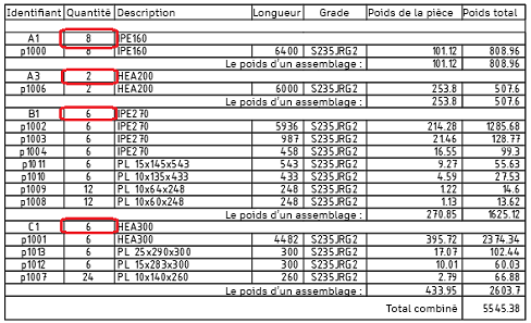 Les quantités indiquées dans la liste pour les pièces simples sont des quantités totales. Dans le cas d'une présentation partielle, la quantité affichée dans la liste pour chaque pièce sera la quantité totale existant dans le modèle de la pièce concernée, même si tous ces objets identiques ne sont pas présents dans la vue.