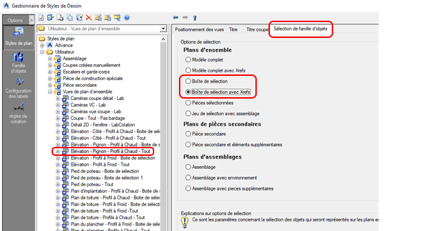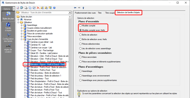 Dans le cas d'une présentation partielle qui a été créée à l'aide d'un style de plan qui utilise les options Modèle complet ou Modèle complet avec Xrefs dans Sélection de famille d'objets (dans le Gestionnaire des styles de plan), les listes créées dans cette vue contiendront tous les objets du modèle, et non uniquement ceux inclus dans la boîte de sélection.